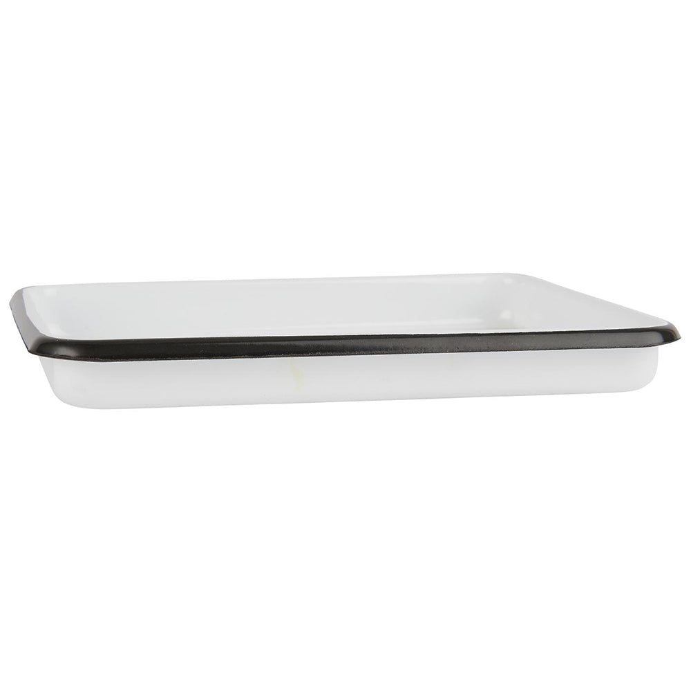 Presenta tu comida de la mejor manera con la Bandeja Enlozada. Cuenta con una base blanca y bordes negros con un estilo moderno, además de ser resistente para uso en la cocina y en el baño. Sus características la hacen apta para alimentos, garantizando que tus platillos se vean apetecibles.