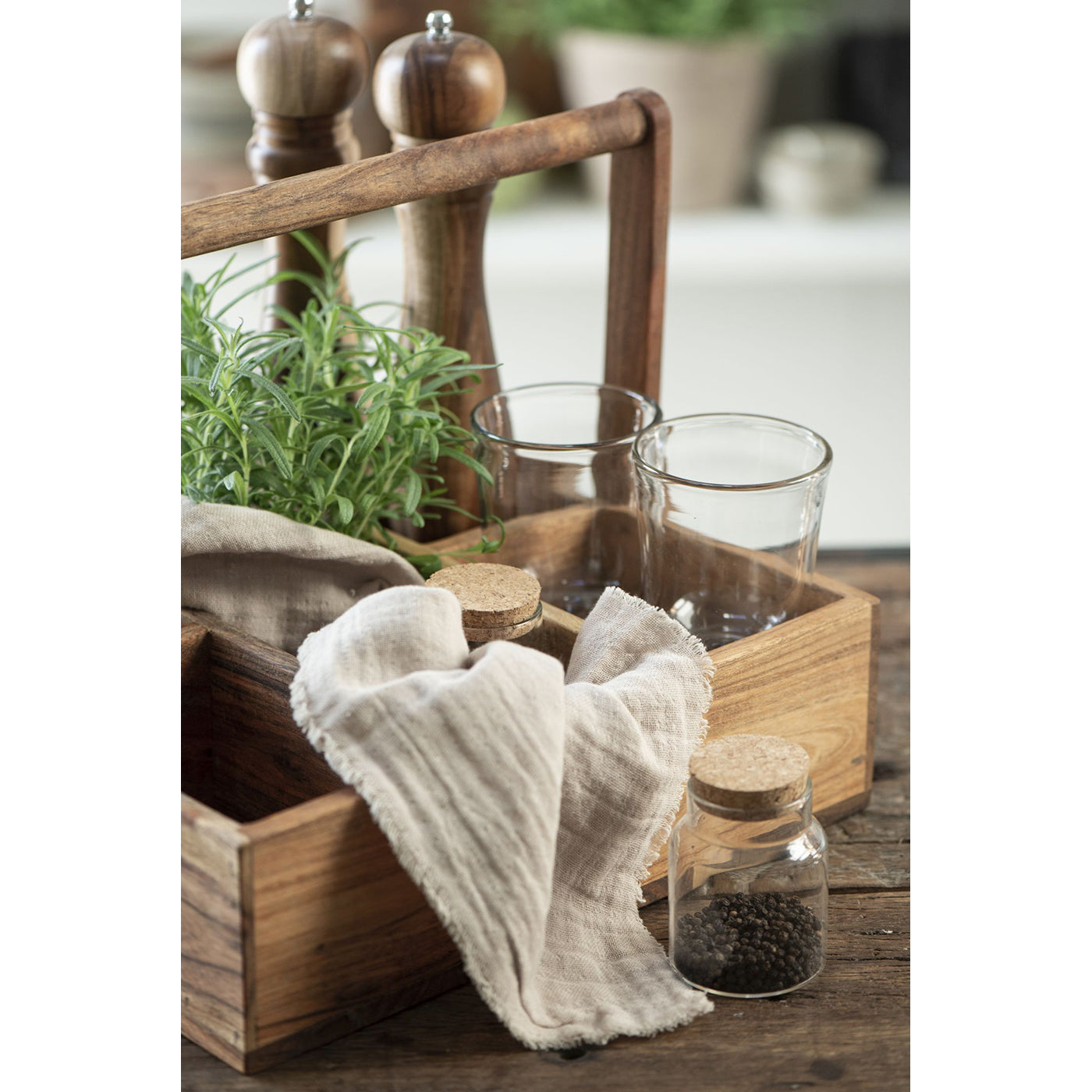 Esta caja está hecha de madera de acacia sólida, ideal para usar en la cocina o para organizar herramientas y materiales. Dispone de un mango móvil que facilita su traslado y diseño práctico que se adapta a diferentes espacios.