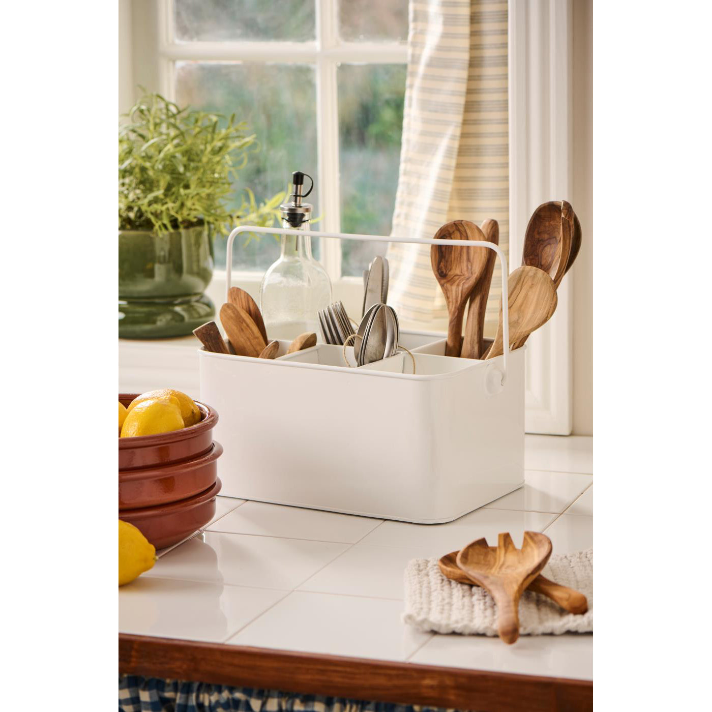 Caja metálica esmaltada en blanco con seis compartimentos y mango, perfecta para transportar aliños y cubiertos a la mesa. También es ideal para organizar utensilios de cocina o de jardín de manera práctica y decorativa.