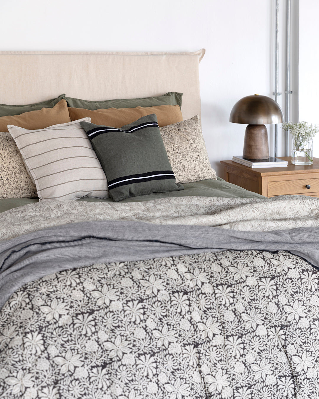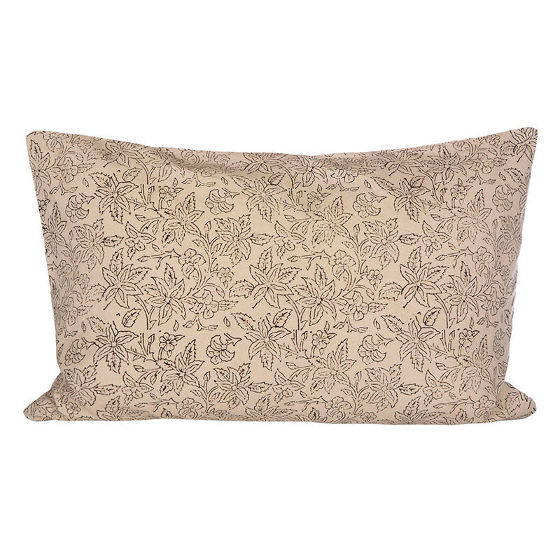 Funda de cojín de algodón con técnica de estampado Blockprint con dos caras diferentes. Borlas de color natural.