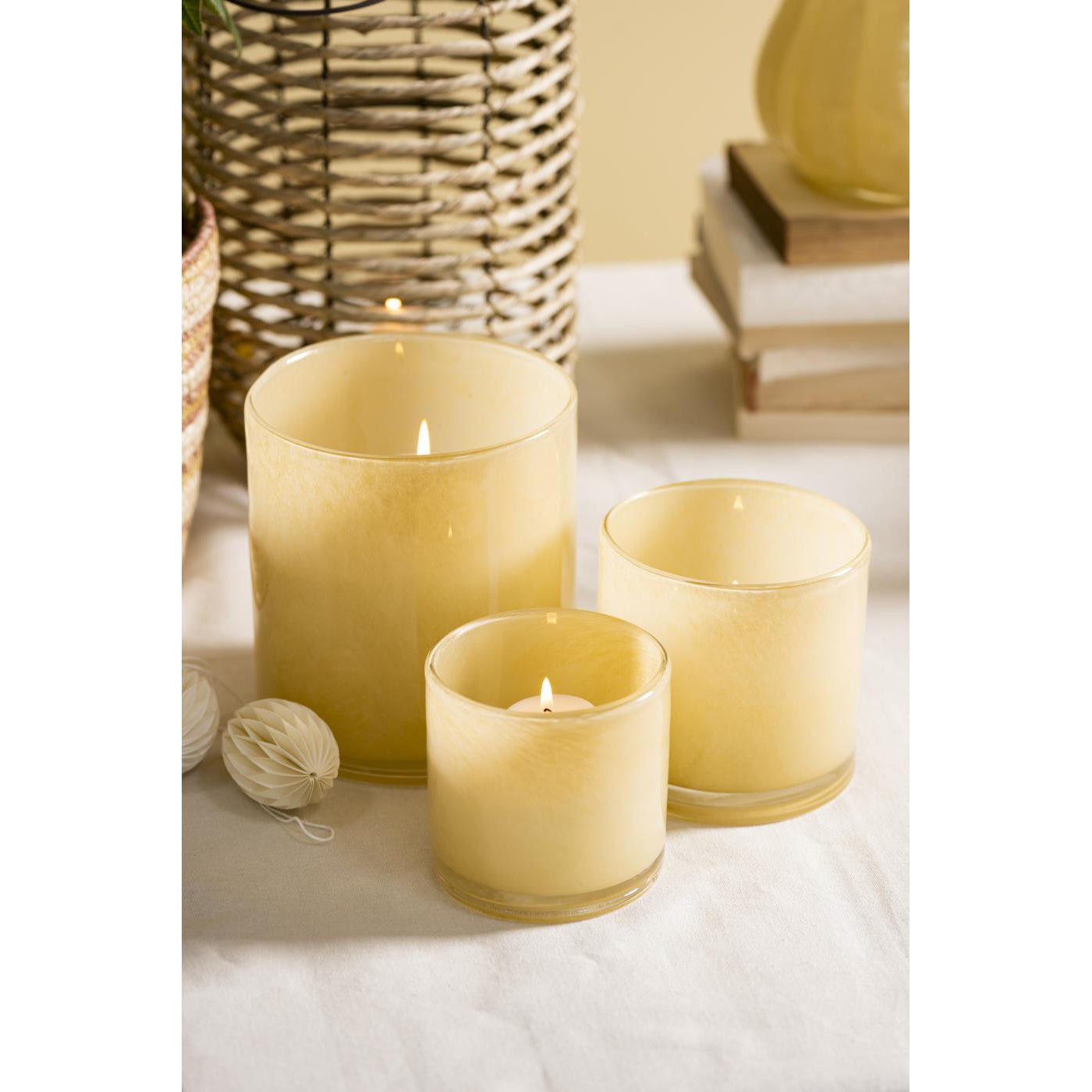 Este florero de vidrio amarillo semi-traslúcido es una pieza artesanal que mantiene su color vibrante lavado tras lavado. Su diseño versátil te permite colocar flores directamente o usarlo como candelabro con velas tealights, creando un ambiente cálido y acogedor. La luz suave que emite resalta la belleza de cualquier espacio, aportando un toque de serenidad y elegancia que hará sentir especial tu hogar.