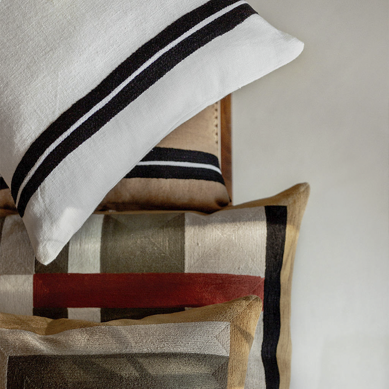 Su juego de contrastes, dos líneas blancas sobre un negro profundo bordado, crea un impacto visual moderno y refinado. Un detalle preciso, pero poderoso, que transforma cualquier espacio con un aire contemporáneo y atemporal.