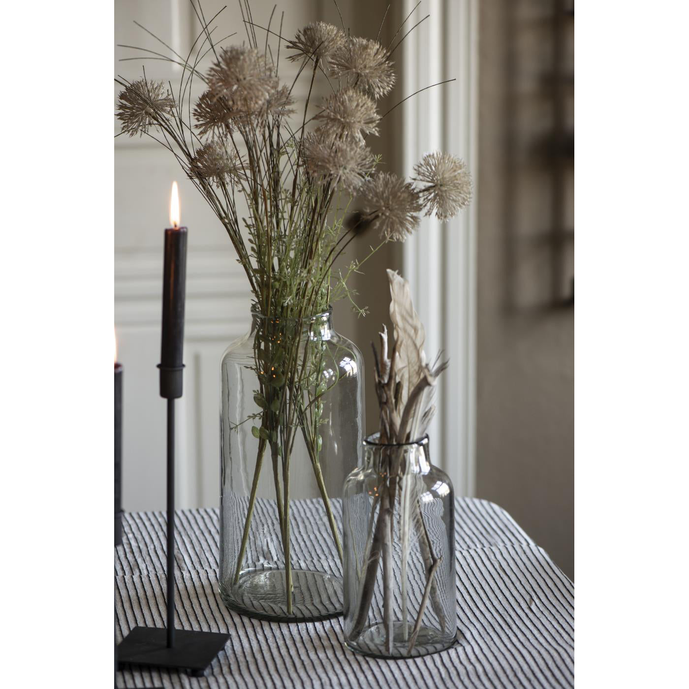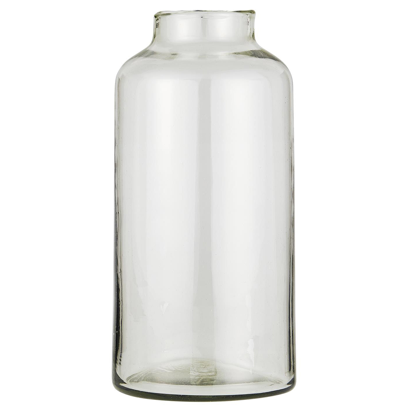 Florero de vidrio transparente. Diseño cilíndrico y cambio de diámetro en el extremo superior.