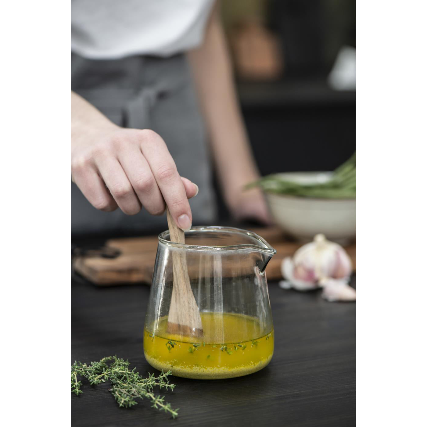 Jarro de vidrio, ideal para preparar aliños. Multiples usos.