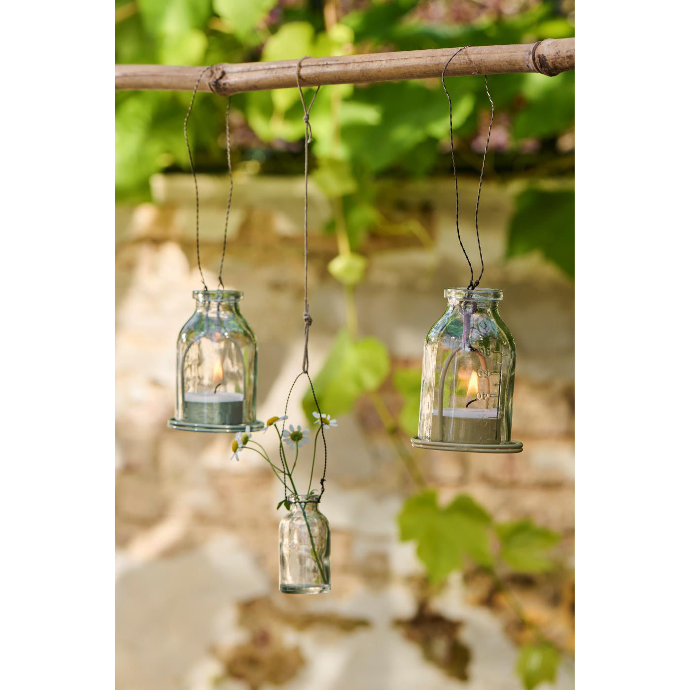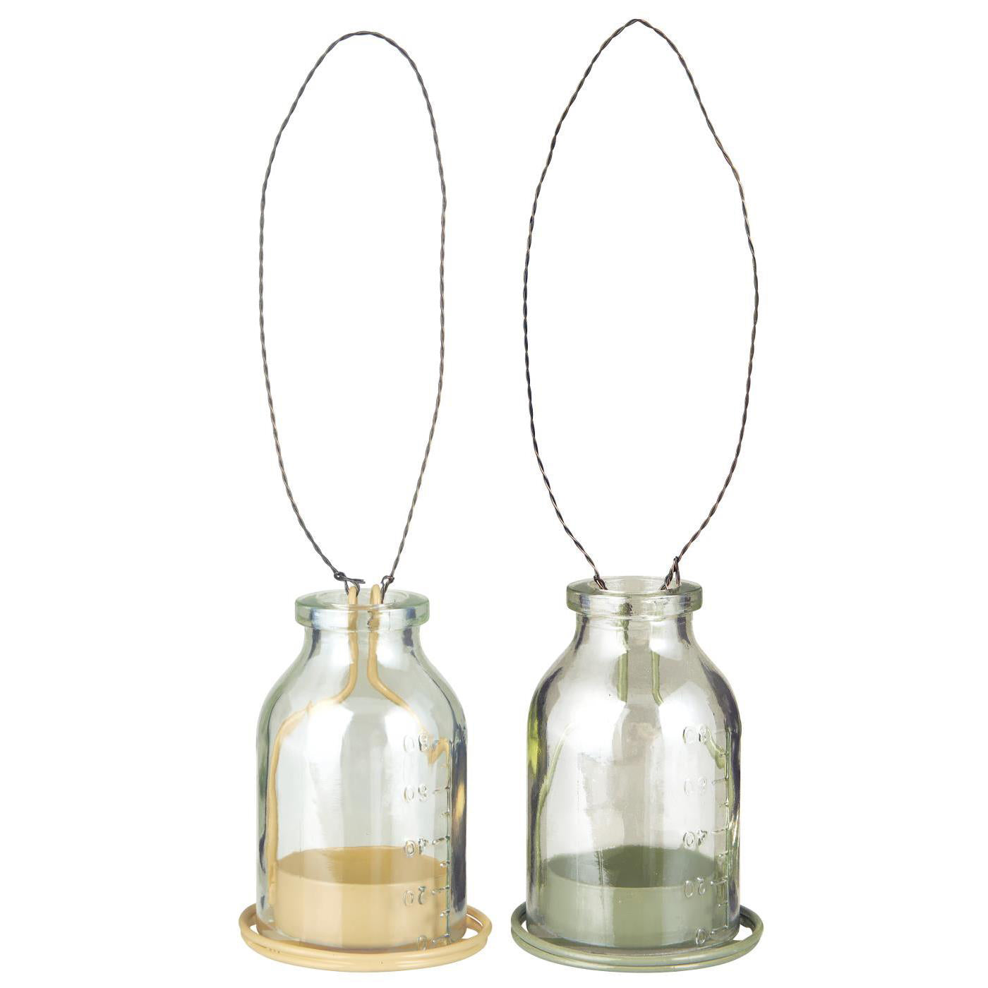 Pequeñas y coquetas lámparas para colgar con base metálica extraíble, donde puedes colocar una vela pequeña. Se pueden colgar de un árbol o en la terraza con un pequeño alambre de metal, para crear un ambiente acogedor. Ten en cuenta que el color del alambre que sostiene las botellitas, se verá afectado por el calor de las velas.