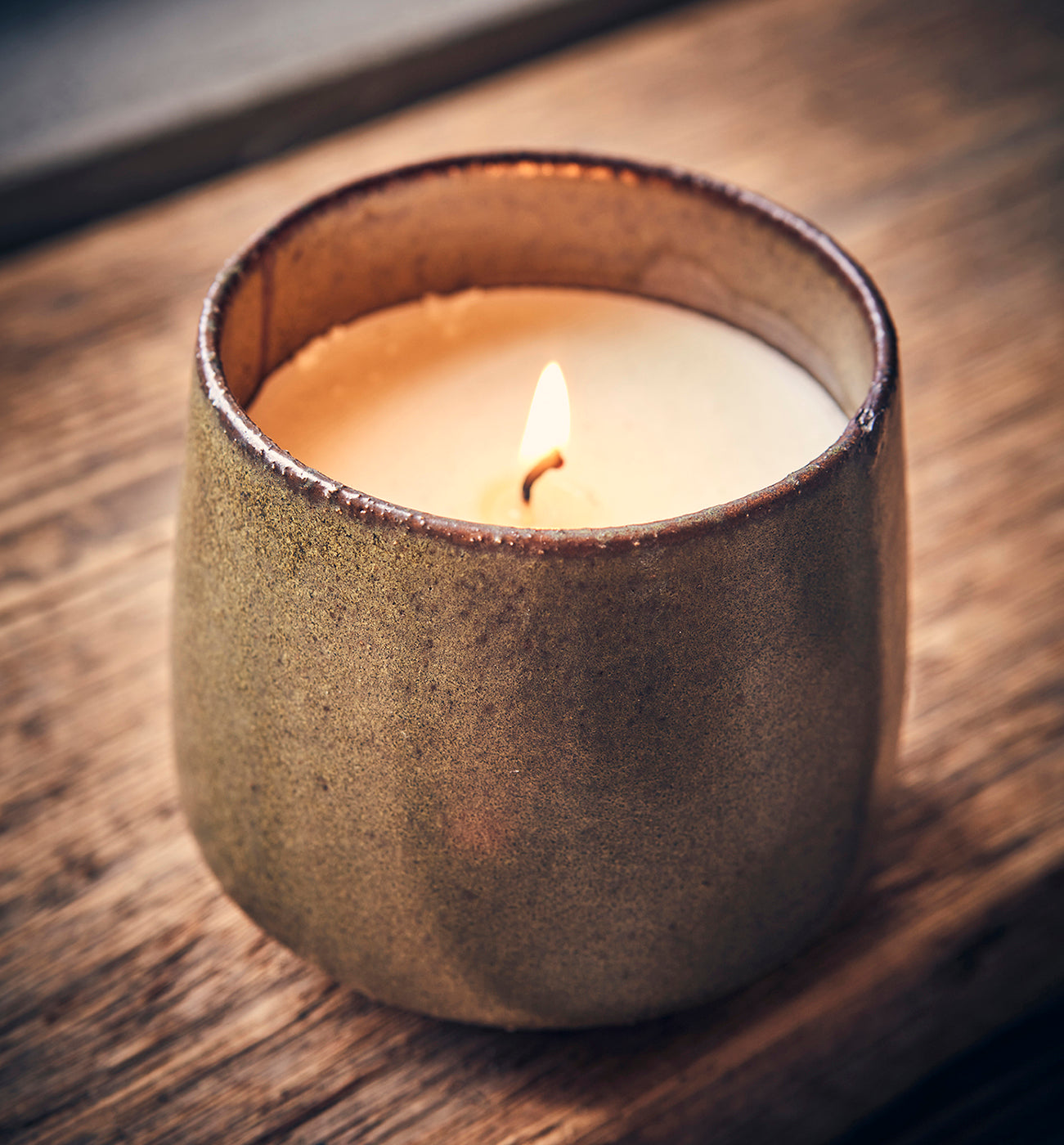Disfruta de la fragancia de la vela aromática RO Mistletoe & wine en un vaso decorativo de cerámica gres con esmalte color oliva. Una vez consumida la vela, puedes reutilizar el vaso para velas de té o como florero.